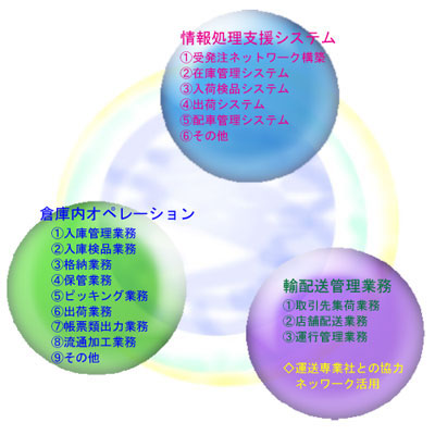 運送専業者との協力、ネットワークを活用し、お客様のニーズに応じて貨物商品の在庫管理、集荷・配送など、幅広い業務を承ります。